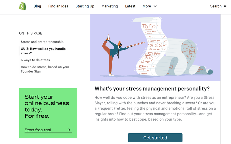 Shopify, which helps businesses build and run online stores, published the “6 Ways to Cope with Stress” post with an embedded quiz that identifies each reader’s stress management personality.